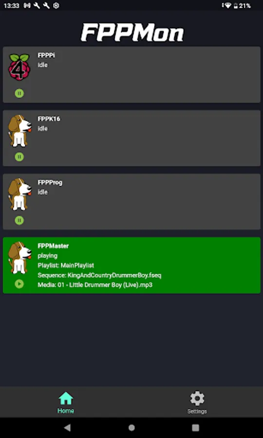 FPPMon is an App that allows a user to remotely monitor, configure, and control their FPP based devices and controllers. The user can quickly see at a glance the status of all their devices and access them remotely if needed. If a device has an issue, alerts can be displayed allowing the user to address issues quicker.