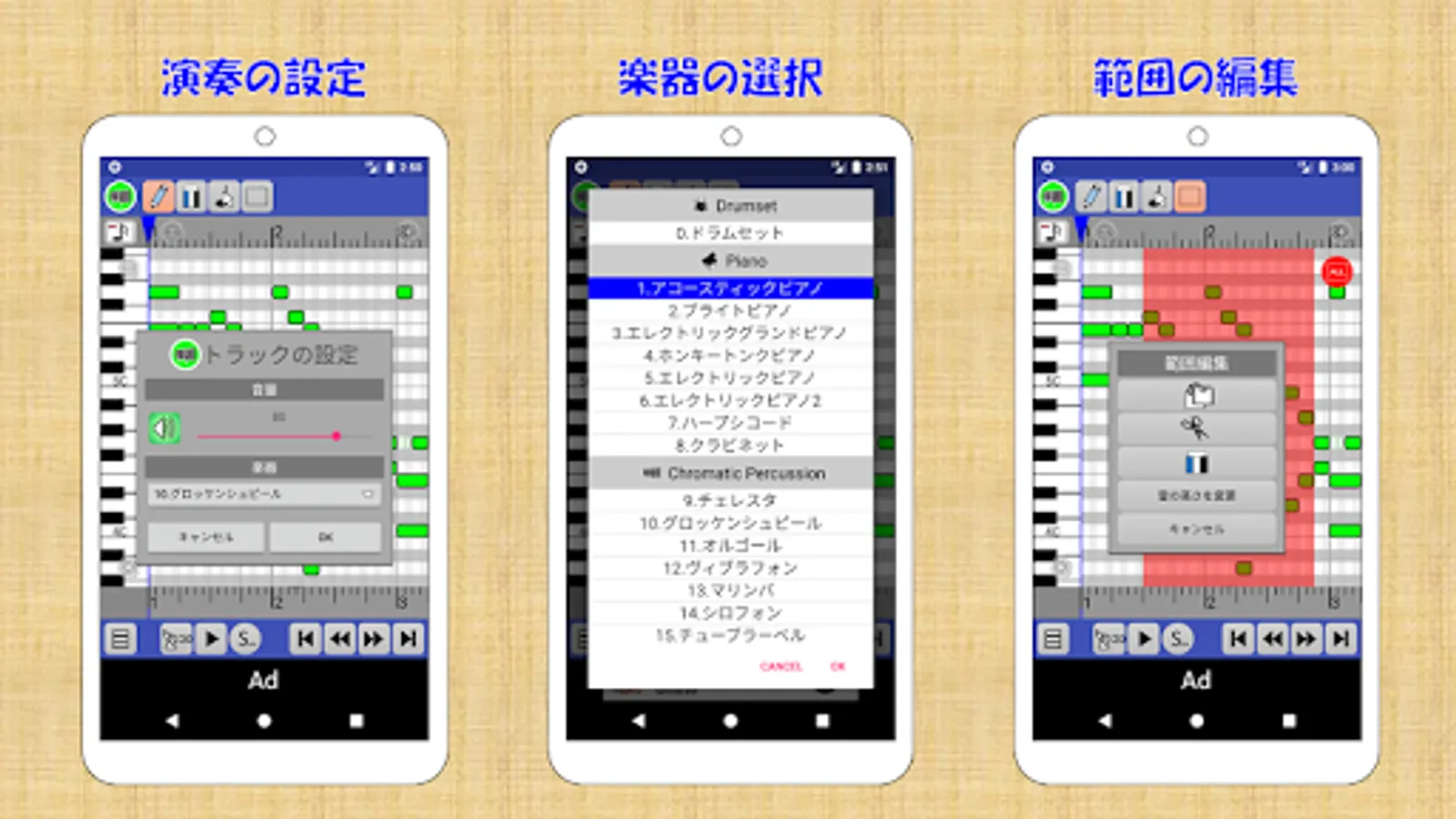 You can input and play notes with the same feeling as drawing software, such as pen, eraser, copy & paste, and Undo / Redo!