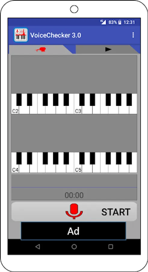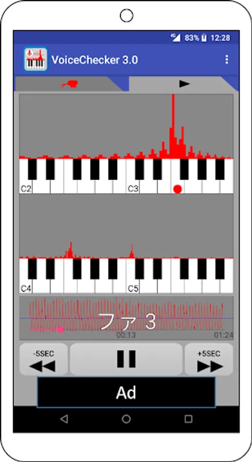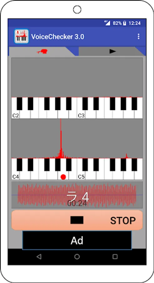 The keybord of a piano is shown as graph horizontal axis and it shows pitch of your voice in range of 4 octorve.
