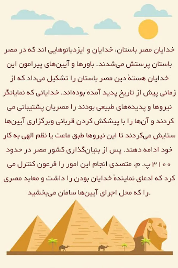 Believing that the gods are present in the world and able to affect natural disasters and human life. The interaction of humans with them in temples and informal shrines for personal interests and also the larger goals of the country's ritual celebrations. The Egyptians prayed for help from the gods and used the rites to make the gods work and ask them for advice. The human relationship with their gods was a principled part of the Egyptian community