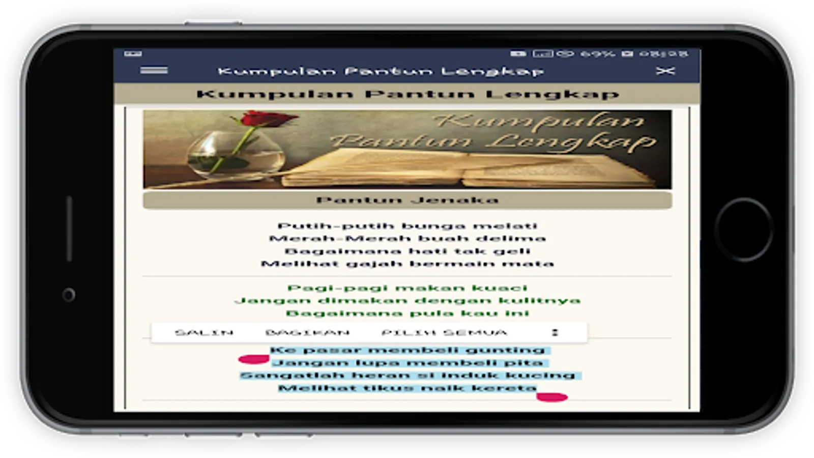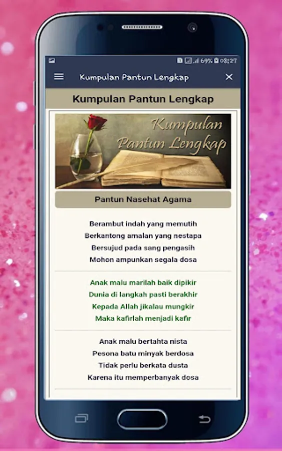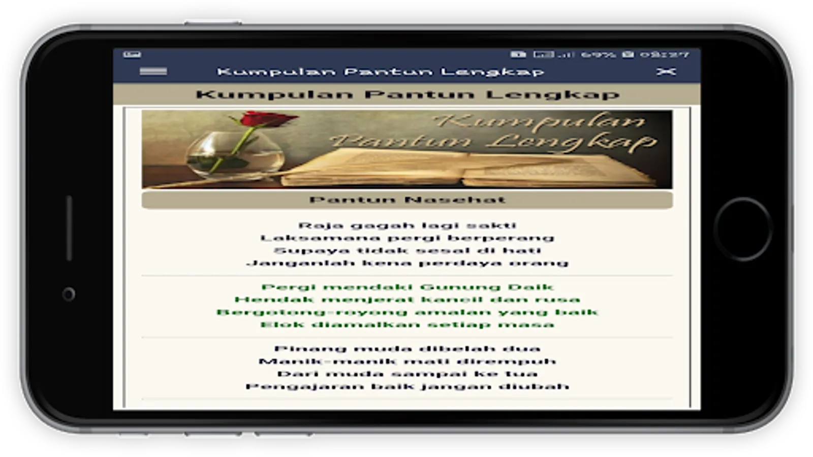 With rhymes, all messages of advice or even jokes (people say punchlines now) become more interesting. Words are also easier to remember when arranged into rhymes. Not surprisingly, people who are good at rhyming are usually very liked by the people around them. The Complete Pantun Collection contained in this application can be entertaining and you can read to give to your closest family or relatives when you are together.