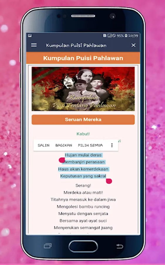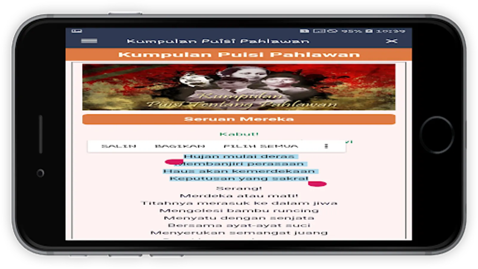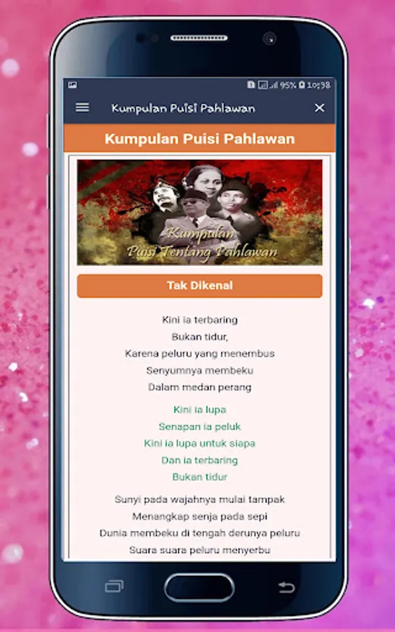 Examples of the poems in this application you can use as a source of inspiration when you want to write Poems About Heroes. You can also share your poetry works on social media. Hopefully the poems about Heroes in this application can be a source of inspiration and motivation for all of us to be able to contribute something useful to fill the independence that these Heroes have fought for.