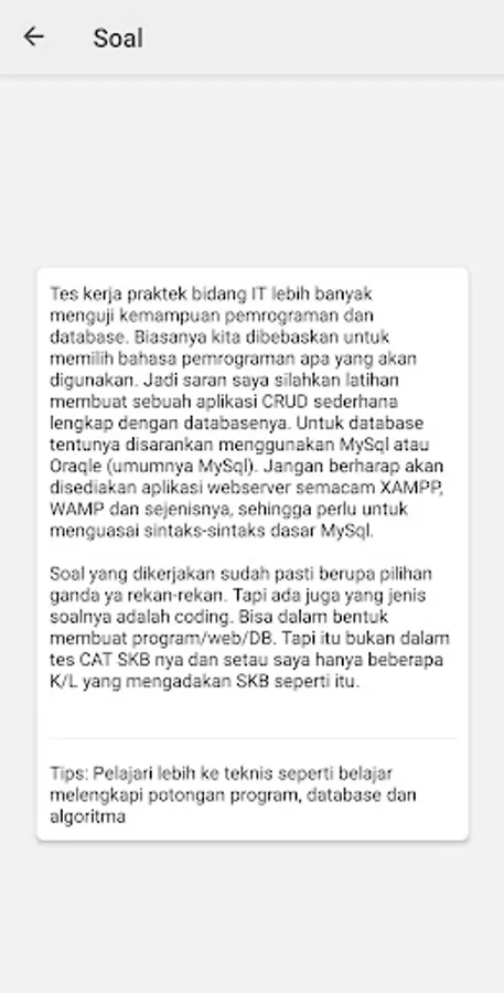 This application contains a collection of SKB SKD Practice Questions for various majors that will continue to update and increase and is very suitable for preparation for the CAT BKN test in CPNS selection, by learning of course the opportunity for us to qualify becomes greater and hopefully help in achieving the dream of becoming ASN / PNS .