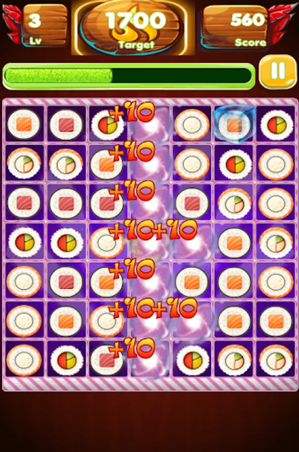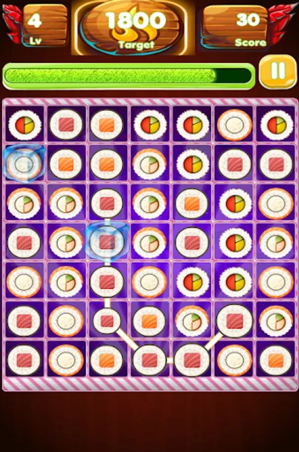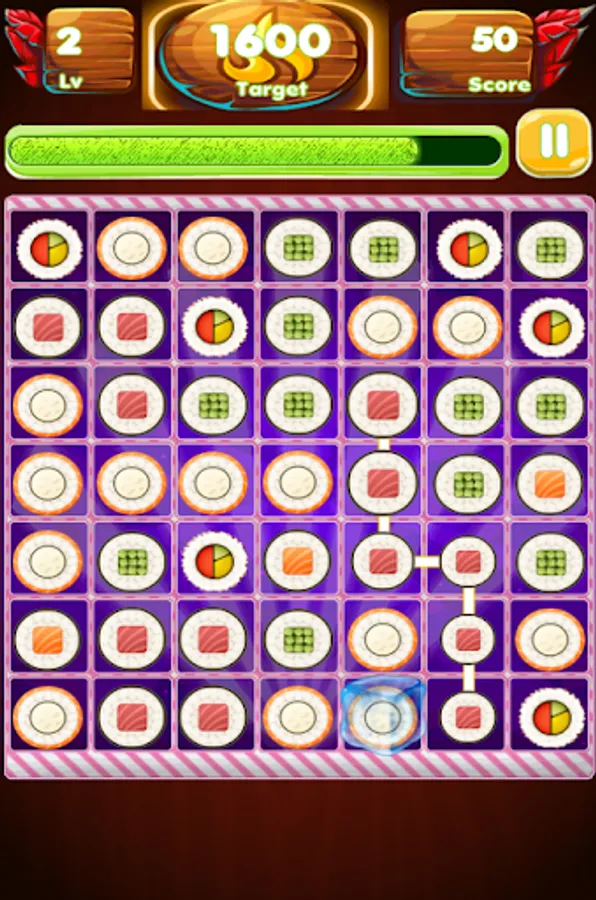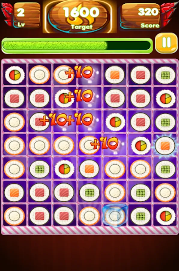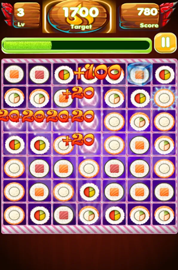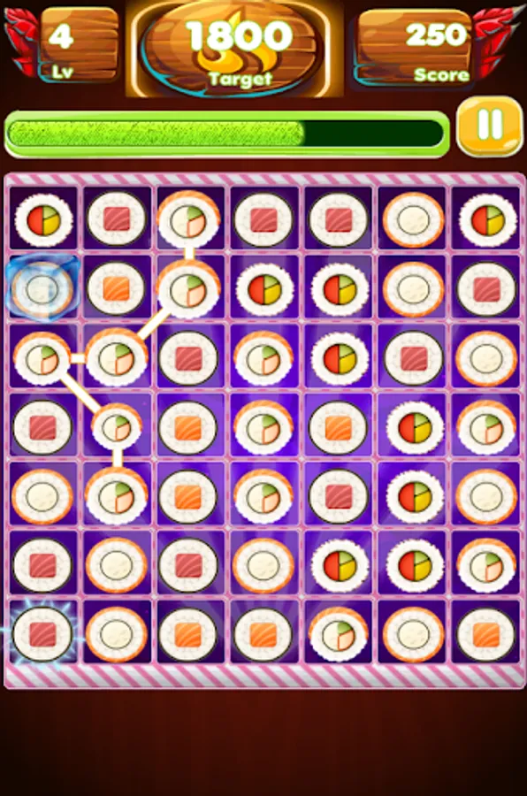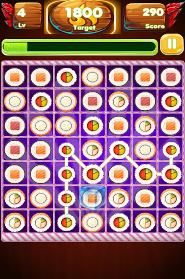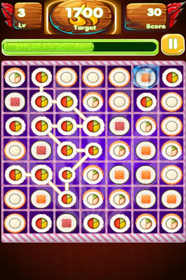 Sushi puzzle type game. Sushi is a new type of match 3 and collect 3 or more for deluxe candies in Sushi.