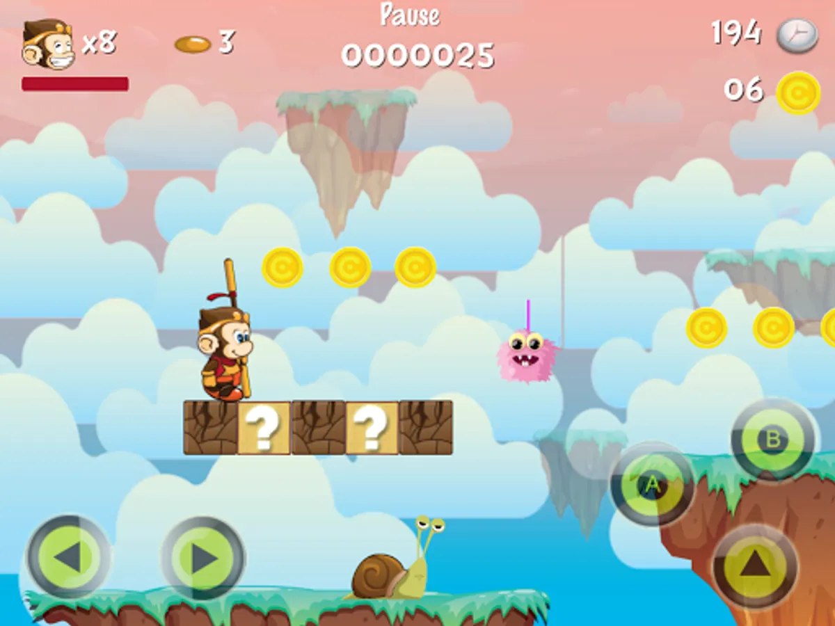 Kong Hero jumps, gets coins, and fights with the monster's enemies using his golden cudgel and gun bullets.
