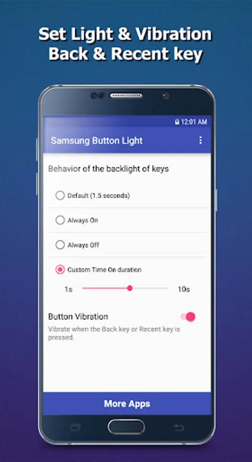 ✔ Samsung Button Light & Vibration is simple tool help you can select how long the capacitive buttons (Recent apps and Back keys) stay light of Samsung devices, enable/disable vibration of keys