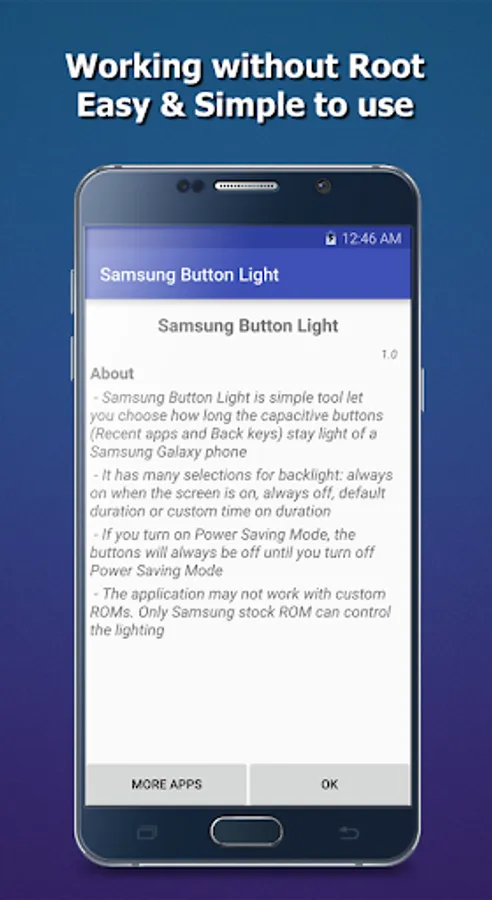 - The application may not work with Custom ROMs. Only Samsung Stock ROM can control the lighting.