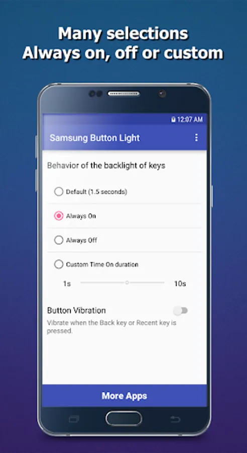✔ This application has many selections for backlight: always on when the screen is on, always off, default duration (1.5 seconds) or custom time on duration by yourself from 1 to 10 seconds.