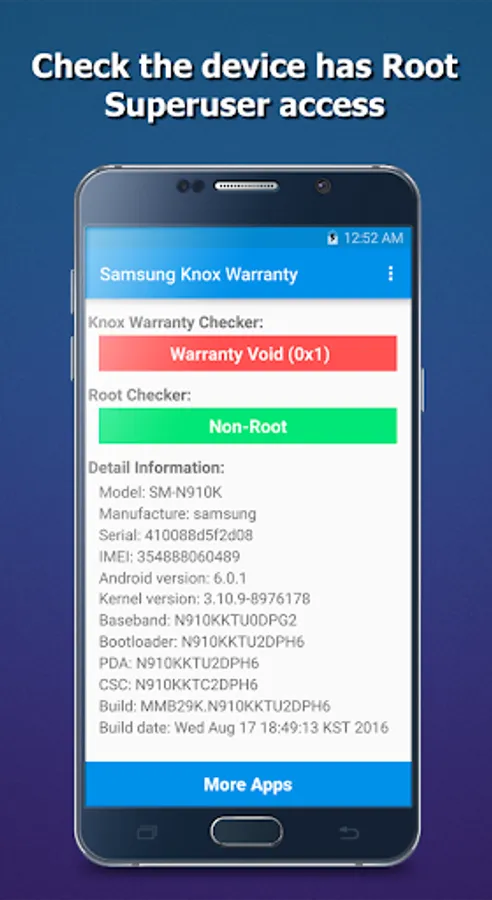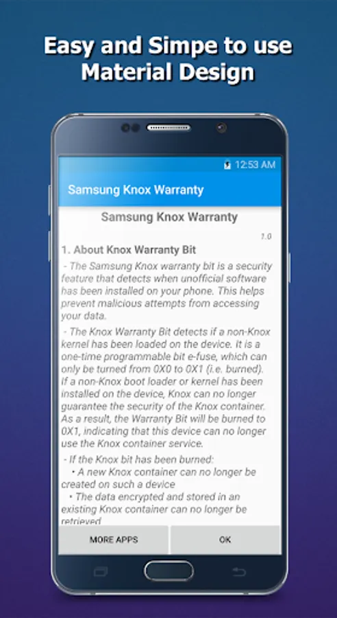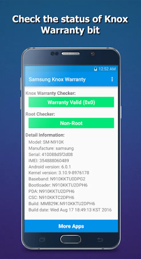 ✔ Knox Warranty Bit (Samsung) Checker application help you can check the status of your Knox Warranty bit (0x0: Warranty Valid; 0x1: Warranty Void)