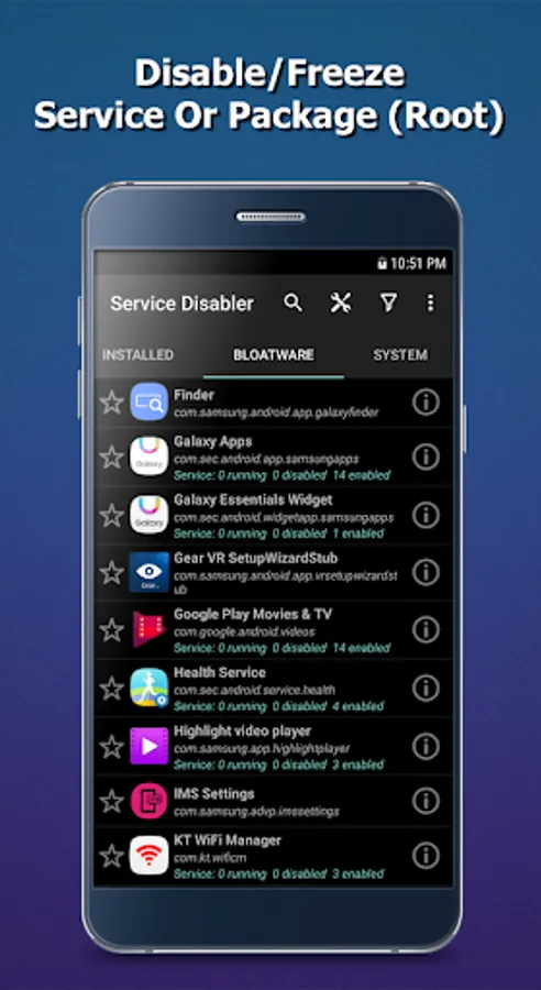 ☆ Service Disabler is the best app forever help you disable, freeze and uninstall unwanted Service or Package (Installed, Bloatware and System) on your Android devices