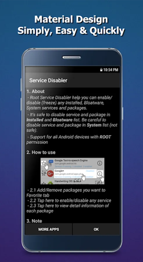 ☆ Service Disabler will disable, freeze service or uninstall package and make them disappear, save your RAM usage, Battery life and improve your Performance. All disabled package is marked unavailable from running and updating.