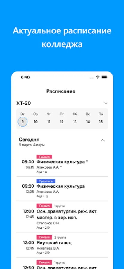 Расписание занятий. Обновляется в реальном времени. При желании можно поставить уведомление на изменение расписании.