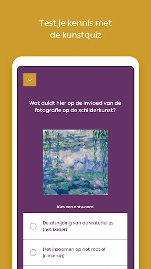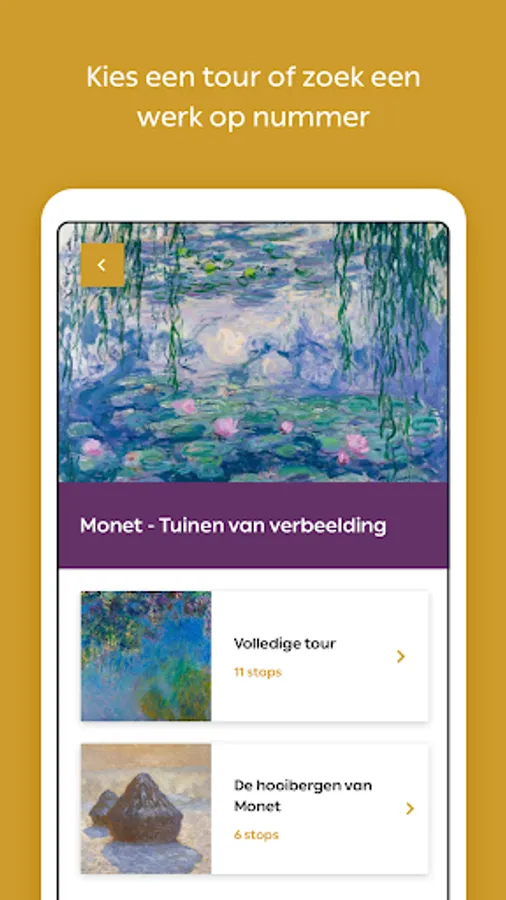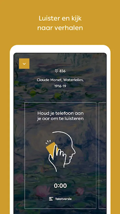 To get lost in art, there is no clear route in the Art Museum The Hague. You decide for yourself which works you want to get close to. Choose from current and permanent exhibitions or search for specific works of art by number. Listen to audio clips, view film clips and test your knowledge.