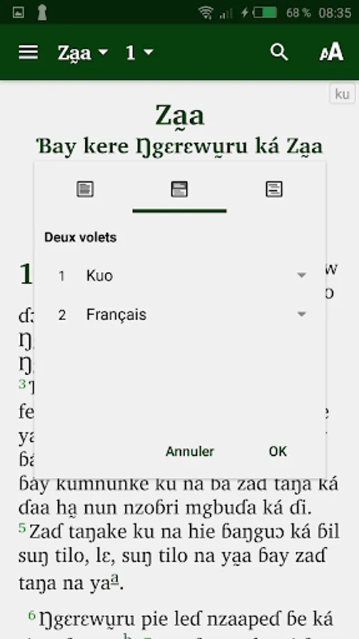 - "verse by verse" to display a verse in Kuo followed by the same verse in French.