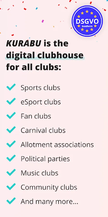 Messages: Receive team messages, files and documents with KURABU. Send messages to the whole team or only to selected groups. Get informed about cancellations or changes, manage carpools, events and much more. GDPR compliant exchange made easy.