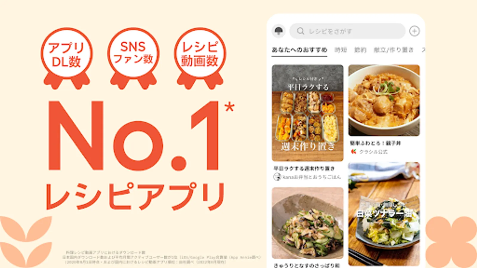 Krasil is the No. 1 recipe platform in Japan in terms of the number of app DLs (* 1), users (* 1), recipe videos (* 2), and total number of SNS followers (* 2). Since the service started in February 2016, we have provided more than 50,000 recipe videos that anyone can safely and deliciously cook under the service concept of “Delicious and warm life” supervised by registered dietitians. I have come. Thanks to you, we have grown into the most used recipe platform in Japan.
