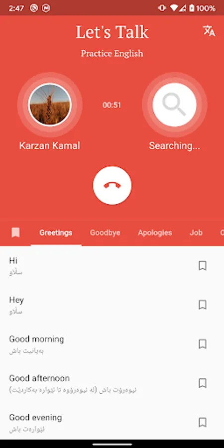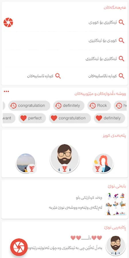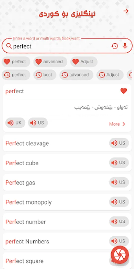 هەر لەم بەشەدا ئەتوانیت لەرێگەی بەکارهێنانی کامێرەوە وێنەی لاپەرەیەکی ئینگلیزی بگریت یاخود نوسراوێکی ئینگلیزیی پاشان پەنجە بدەی لەو ووشەیەک زۆر بەخێرای بۆت ئەکاتە کوردی واتە پێویست ناکات هیچ ووشەیەک بنوسیت. .