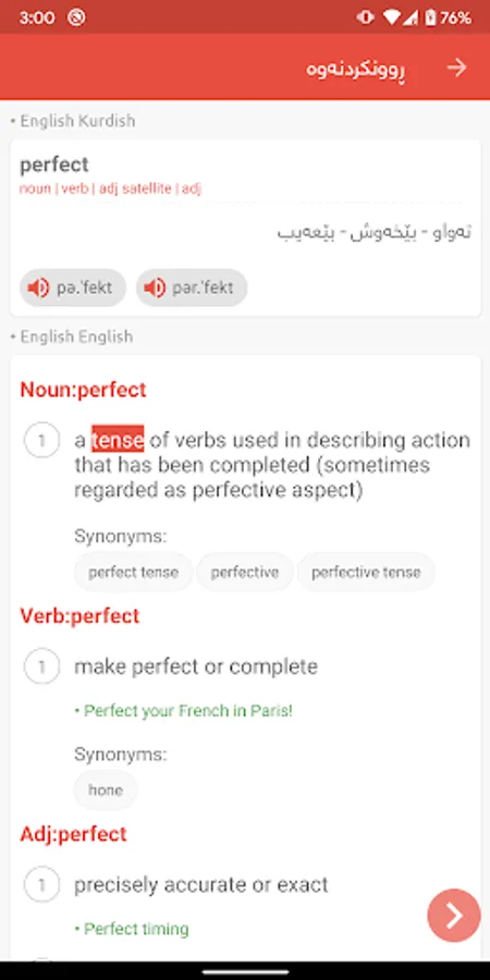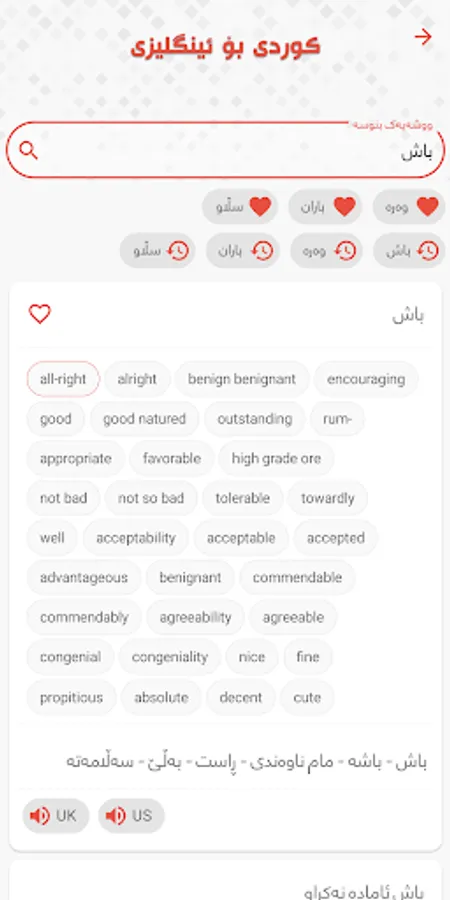زۆربەی ووشەکان رونکردنەوەی بە زمانی ئینگلیزی لەگەڵدایە، گرنگی ئەم بەشە لەوەدایە هەندێ جار ئەو مانایەی کە ئەتەوێت لە کوردییەکەدا دەستت ناکەوێت ئەتوانیت لە ئینگلیزییەکەیەوە دەستت بکەوێت، وە هەر ووشەیەکی ئینگلیزیش ماناکەیت نەزانی تەنها پەنجە بدە لە ووشە ئینگلیزیەکە راستەوخۆ مانا کوردییەکەی و ڕونکردنەوە ئینگلیزیەکەیت ئەداتێ.