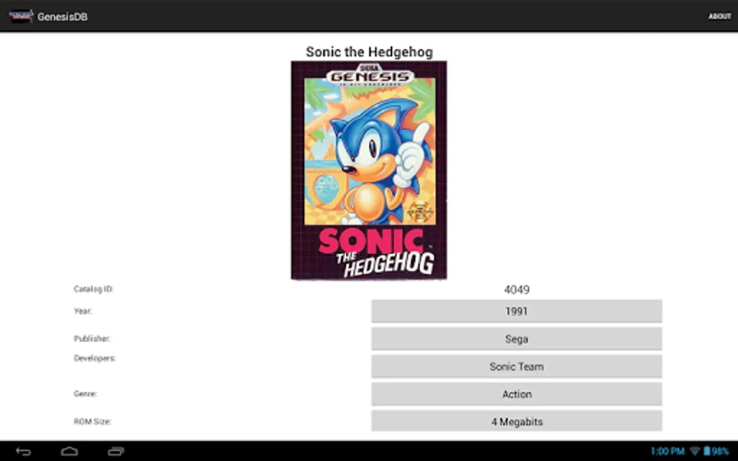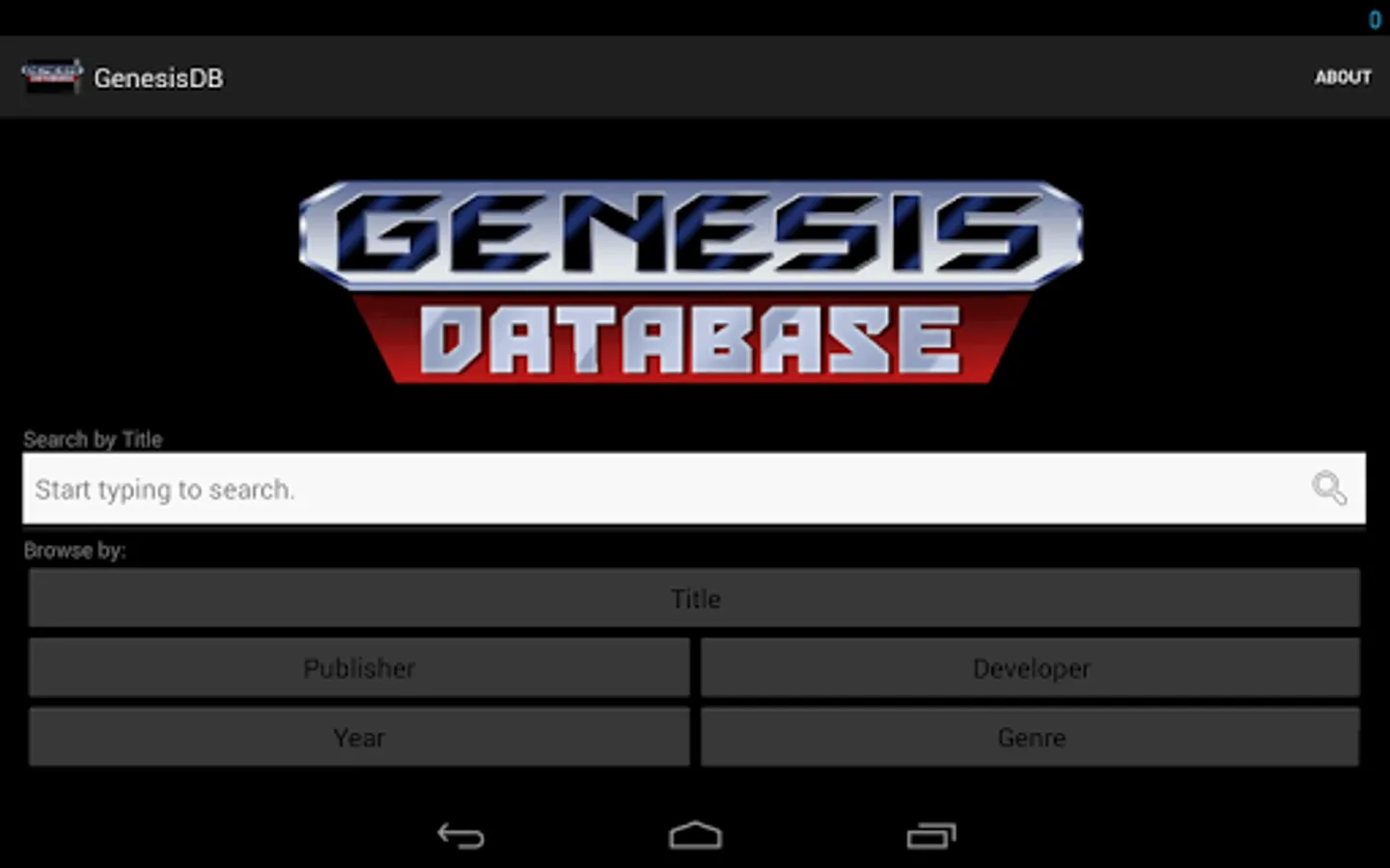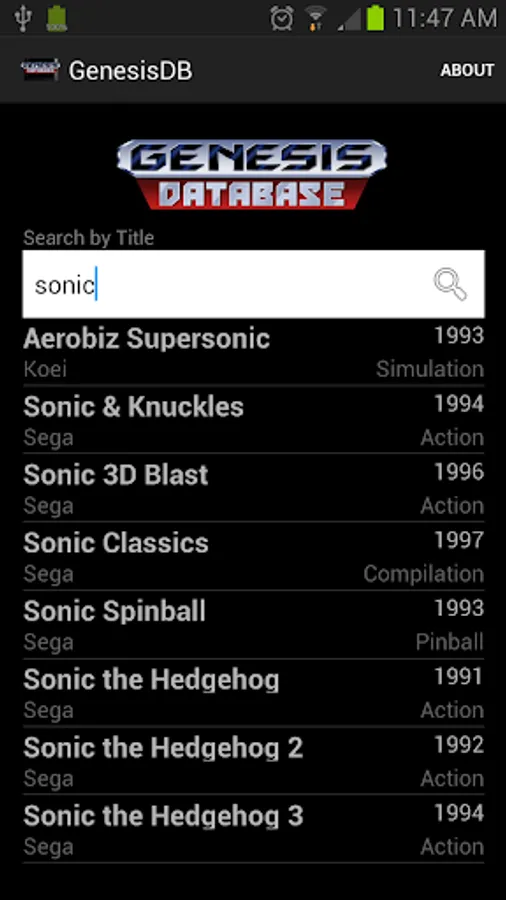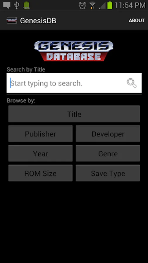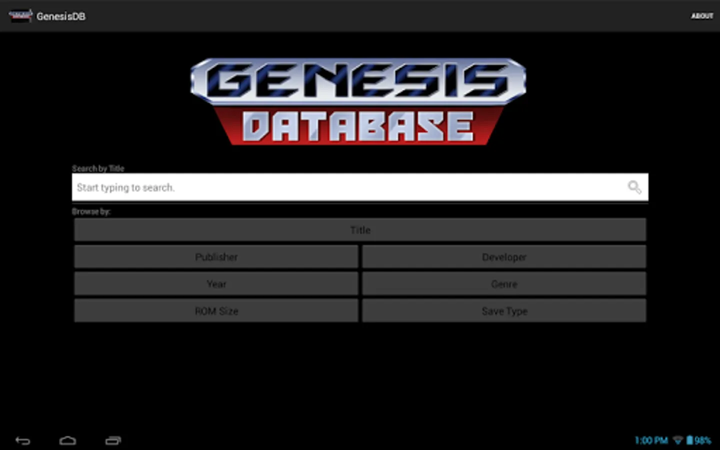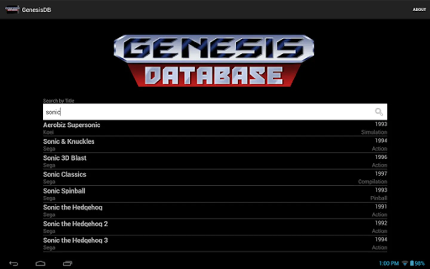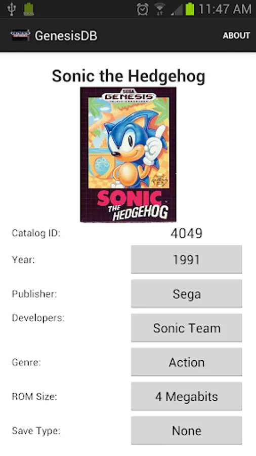 A comprehensive, detailed database of SEGA Genesis games. Search for games by title or browse by a number of categories, including year of release, publisher/developer, and even ROM size and save type! Each game's details are cross-reference-able, allowing easy access to lists of games with the same publisher, developer, size, and the like. Boxart is available for nearly every game in the database, and is downloaded on-demand to minimize the app's size.