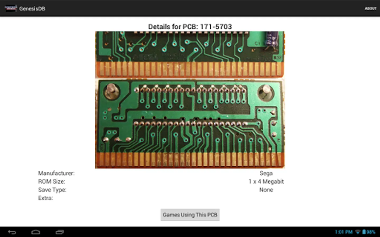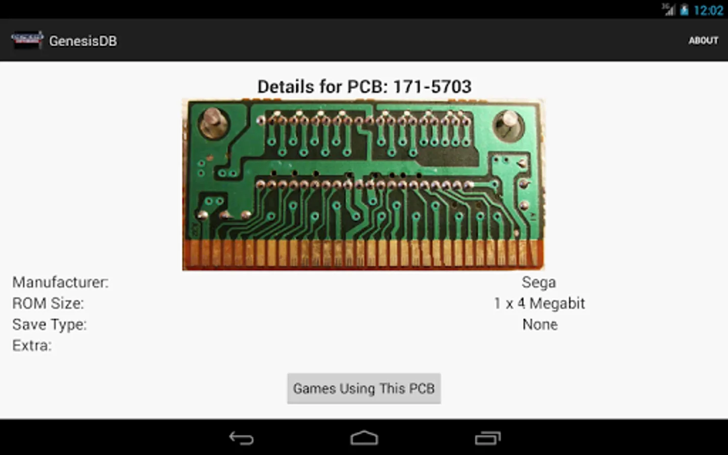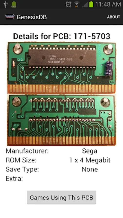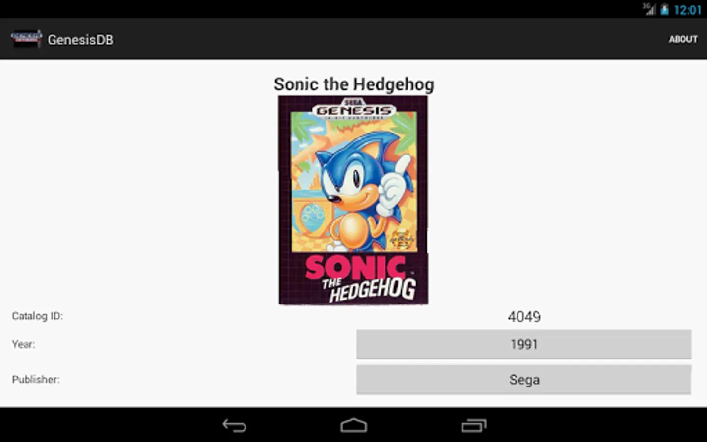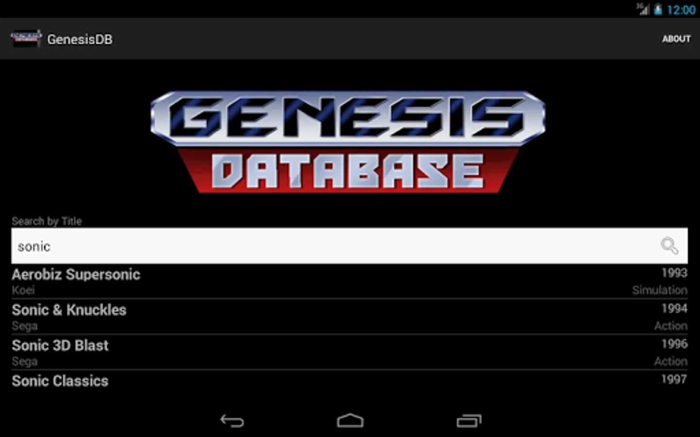 A comprehensive, detailed database of SEGA Genesis games. Search for games by title or browse by a number of categories, including year of release, publisher/developer, and even ROM size and save type! Each game's details are cross-reference-able, allowing easy access to lists of games with the same publisher, developer, size, and the like. Boxart is available for nearly every game in the database, and is downloaded on-demand to minimize the app's size.