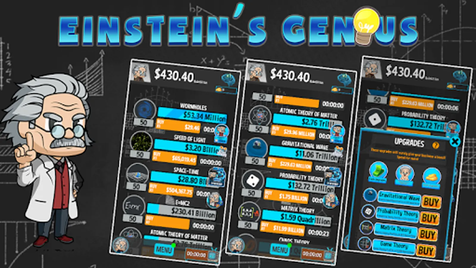 Einstein's Genius - idle resource manager challenge is a free idle game where you build away a lot of workstations in your laboratory 🔬 and continue on experimenting a lot of cool Einstein work and collect idle cash 💵.