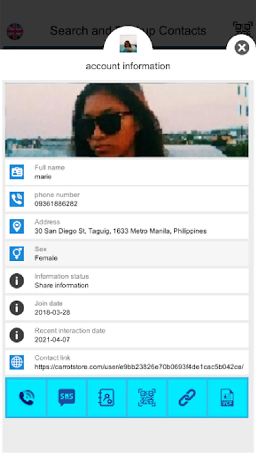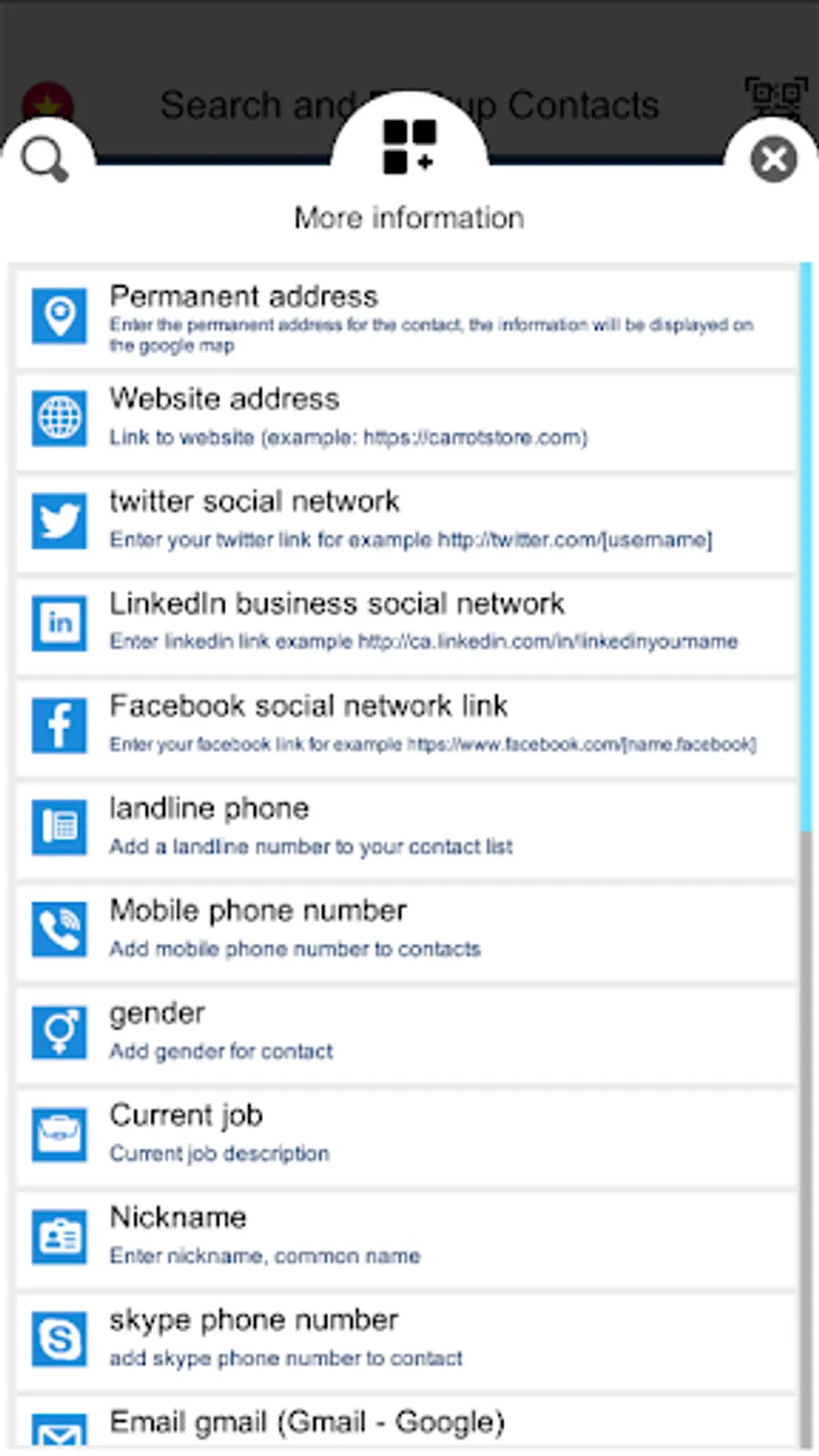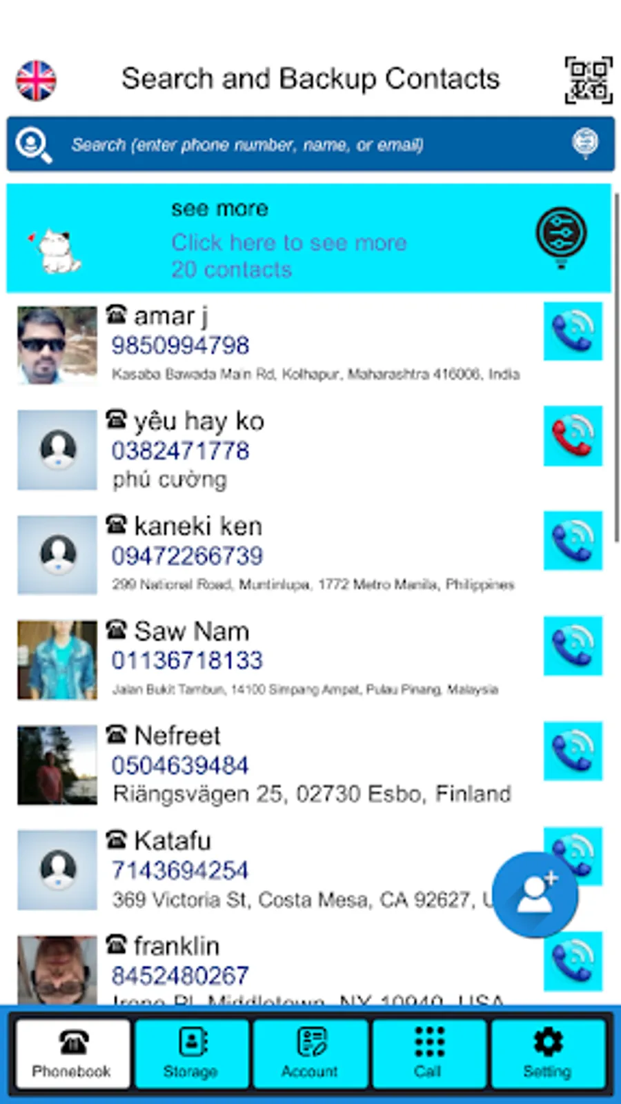 Application has many special search function , add contacts and many other special things,You can Backup and Recovery contact online