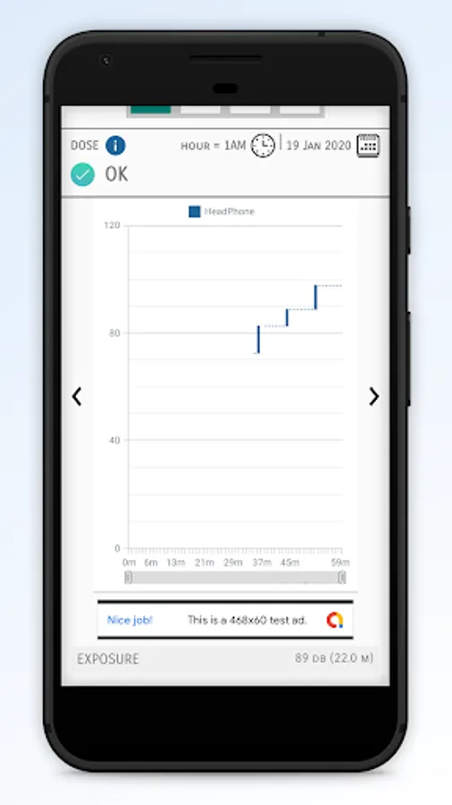 Reliable audio levels from headphones usage, with the decibel levels categorized into 2- OK and Loud.