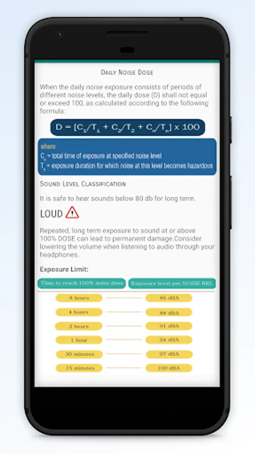 DOSE percentage helps you to find out by how much percentage you have exceeded your dB levels or if you’re in the OK zone. DOSE levels per day should not exceed 100% else you may be susceptible to ear health problems in the future. Infographics provided for exposure limit and dose calculation.