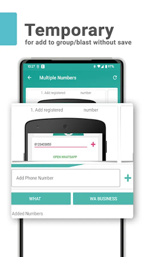 • Bulk numbers for Group/Broadcast - You don't need to name individual phone numbers if you have a list to contact. Just use our Temporary Numbers to save multiple numbers as "Temporary", open WhatsApp, search the keyword "Temporary" and add those numbers to a group or make a broadcast list.