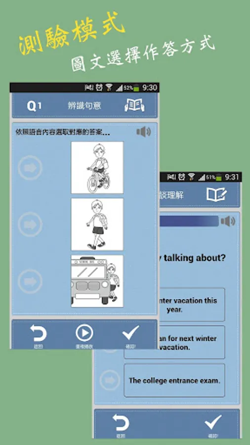 单一来回对话的问答,评量是否掌握简易对话的基本沟通功能,只要依据所听到的单一问句,选出一个最适合的回答即可。