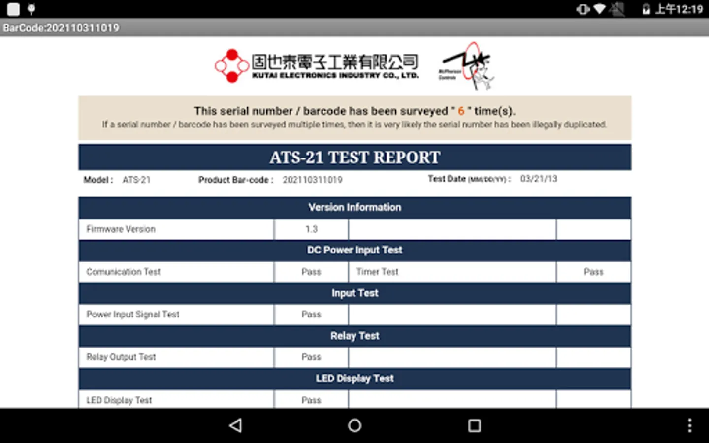 The Kutai Barcode App is a barcode scanning software that enable customers to obtain Kutai product testing report via smart phone application. All products manufactured by Kutai Electronics undergo series of quality and performance testing and the data are generated into a test report and kept on our server for customers to download and reference.