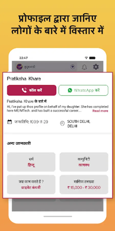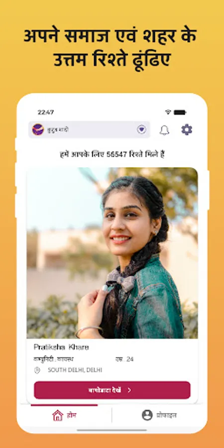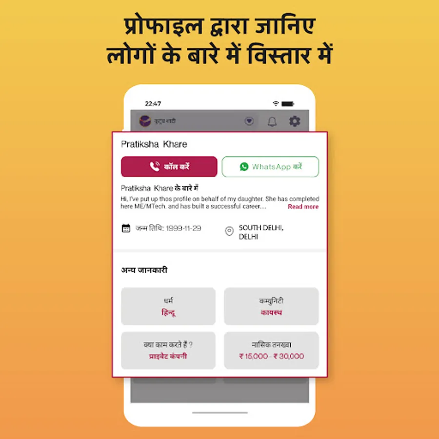 इसमें आप अपने लिए या फिर अपने बच्चे के लिए प्रोफाइल बना सकते हैं। प्रोफाइल बनाना बेहद आसान है और इसके लिए आपसे चंद जरूरी बातें हीं पूछी जाती हैं, ताकि हम आपकी रुचि को सही तरीके से समझ पाएं और आपको और आपके परिवार को सरल और सुगम अनुभव मिल सके। आप ये जवाब भर कर आप बड़ी आसानी से अपनी प्रोफाइल बना सकते हैं। प्रोफाइल बनाने के बाद आपको हमारी ओर से आपकी पसंद और चयन अनुसार ही रिश्ते दिखने लगते हैं। पसंद आने वाले सभी रिश्तों से आप सीधे जुड़ सकते हैं और इतना ही नहीं आप अपने पसंद के रिश्तों से व्हाट्सएप या फोन पर सीधे संपर्क कर सकते हैं और उनसे बात कर रिश्ते के बारे में और अधिक जानकारियां प्राप्त कर सकते हैं। आपके इलाके और शहर की नई प्रोफाइल आपको हर दिन अपडेट होकर आपको दिखाई देंगी। इस ऐप में आप अपनी रुचि के अनुसार भी अपने रिश्ते को ढूंढ पाएंगे। आप अपनी पसंद या नापसंद चीजों और बातों को अपने विवरण में साझा कर सकते हैं ताकि लोग आपके बारे में बेहतर तरीके से जान सके।