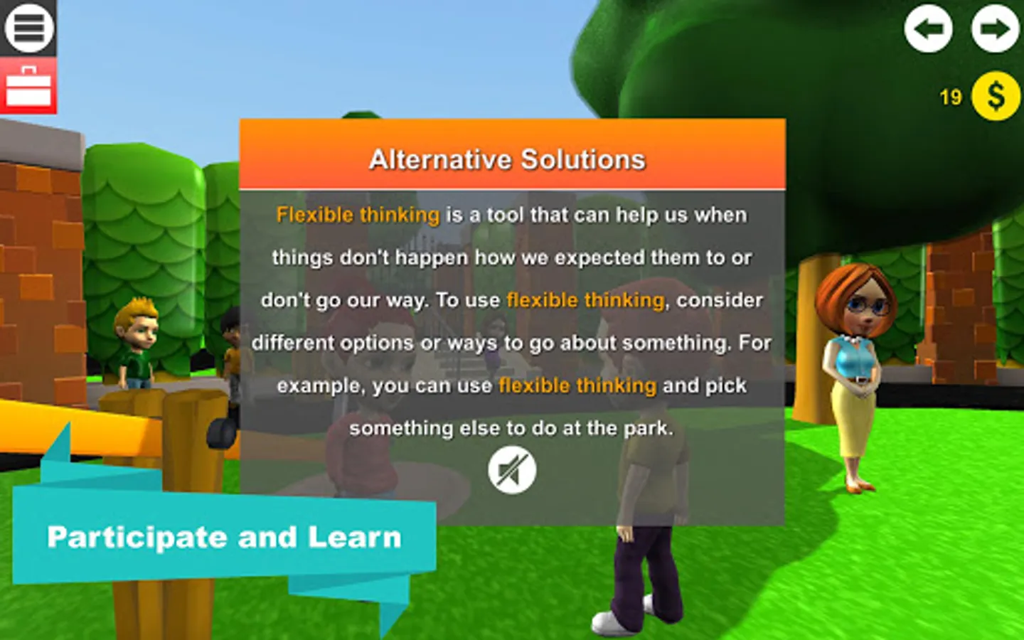 • Multiple environments including a classroom, a cafeteria, and a park that offer different scenarios, events and activities to participate in. Students easily relate to the various situations presented throughout the app, helping them to make connections between learning in the app to real life.
