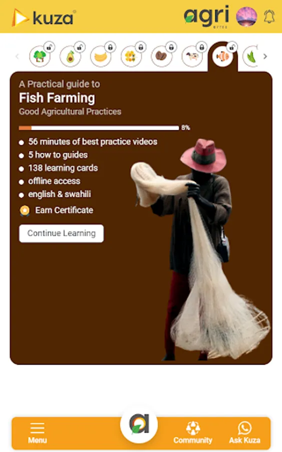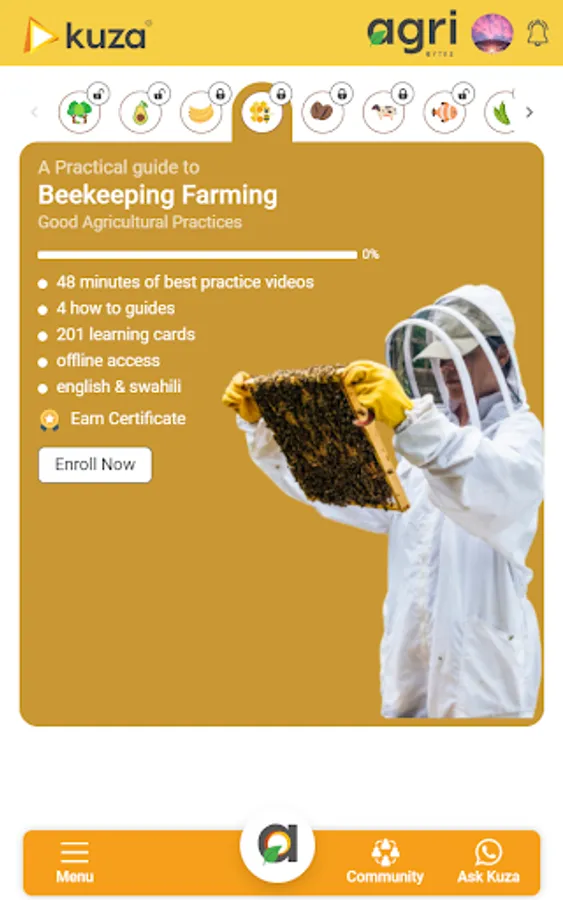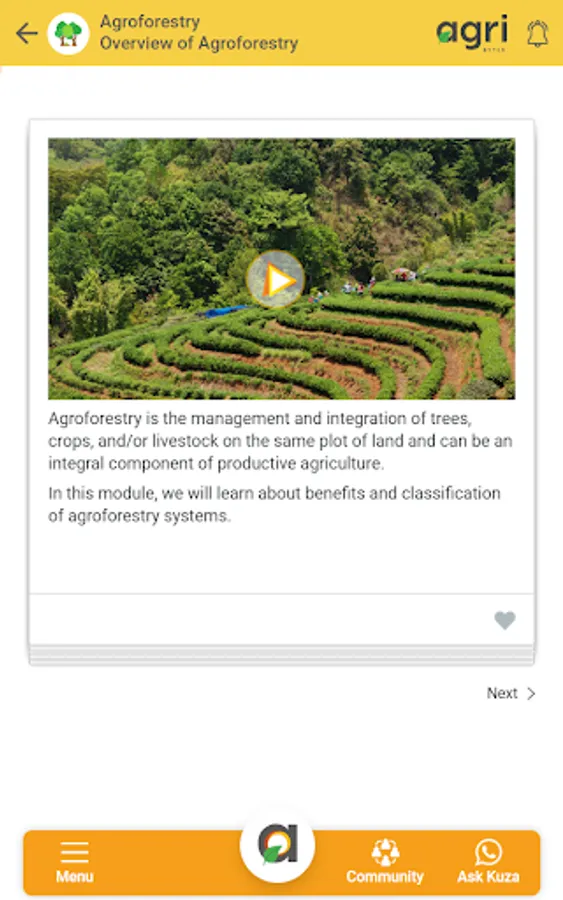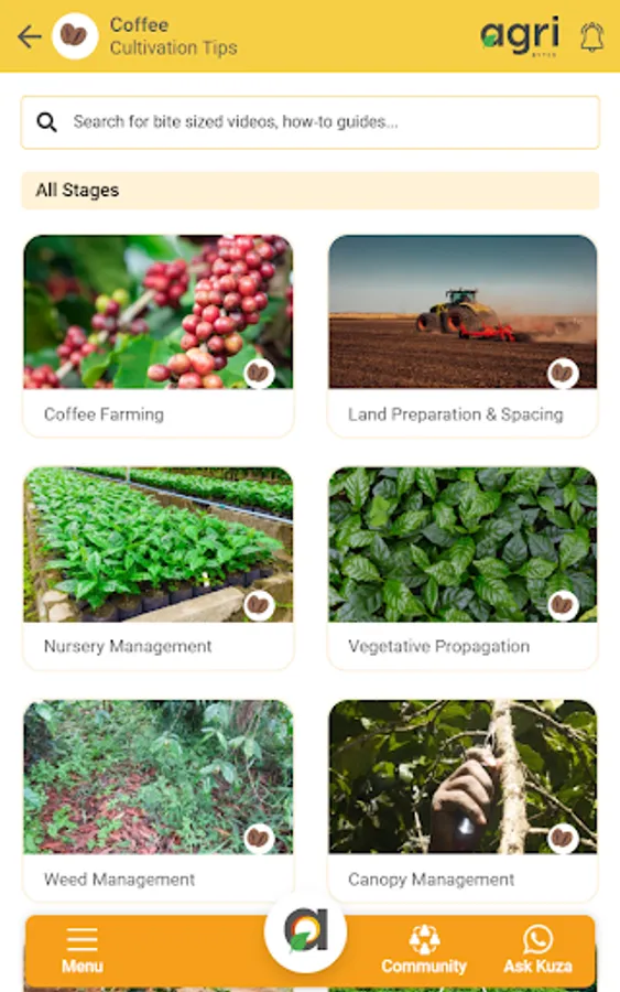 AgriBytes is the digital platform for Agripreneurs to learn Good Agronomy Practices at their convenience. This app provides information on various agronomic practices that are a vital part to farming systems, improve soil quality & water usage, manage crops and improve the environment. Adoption of these Good Agronomic practices can help producers decrease input costs & increase income by avoid post harvest losses. The app has got a simple & intuitive interface that allows the users to navigate through the app. Users can pick a value chain of their choice to learn further