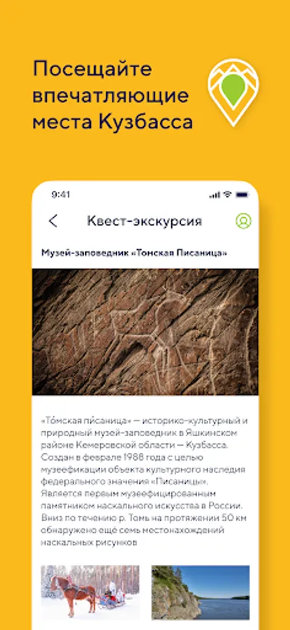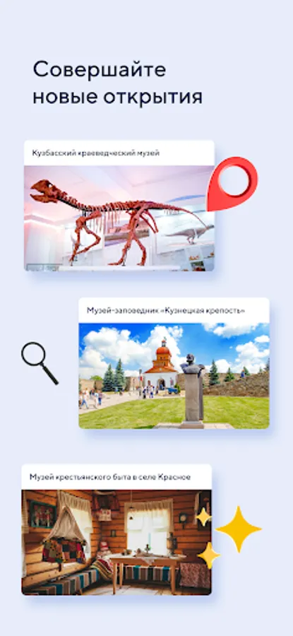 get a mark on the passage of the display object in the application. When all the obligatory attractions are visited, and the quizzes are passed, get the "Young tourist of Kuzbass" badge.