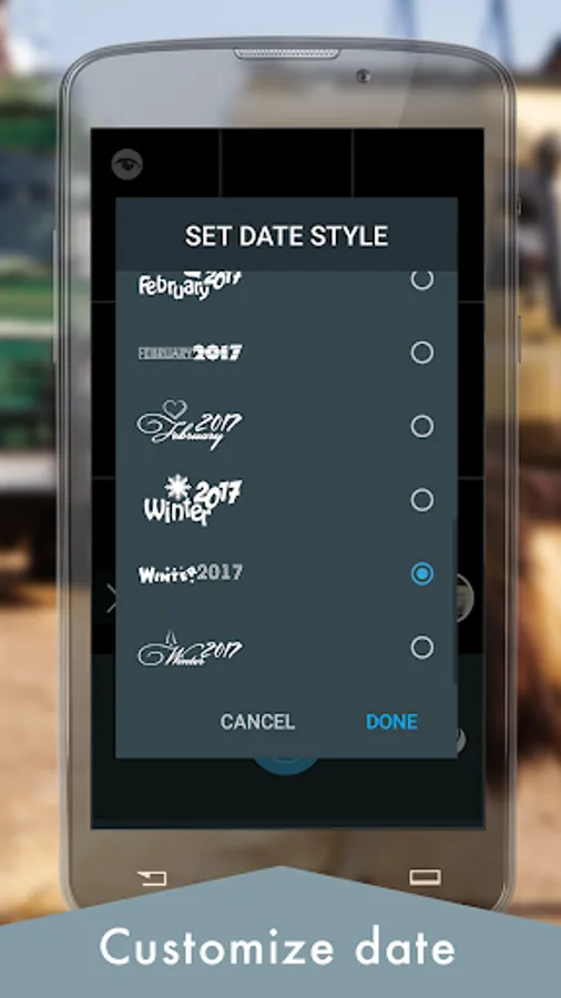 Camera effects with date. Choose the style of data and add it to your creative selfie.