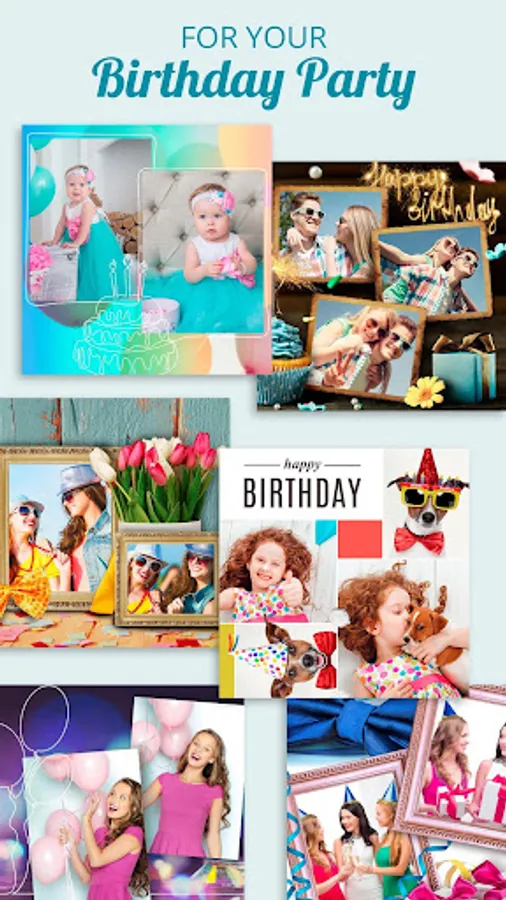 * Birthday collage. Use Collage+ as a birthday collage app. Choose colorful birthday frames and collages to create your personal birthday party collage. Collage+ picmix, slideshow with music, album maker is birthday frame app with happy birthday frames and cool collage.