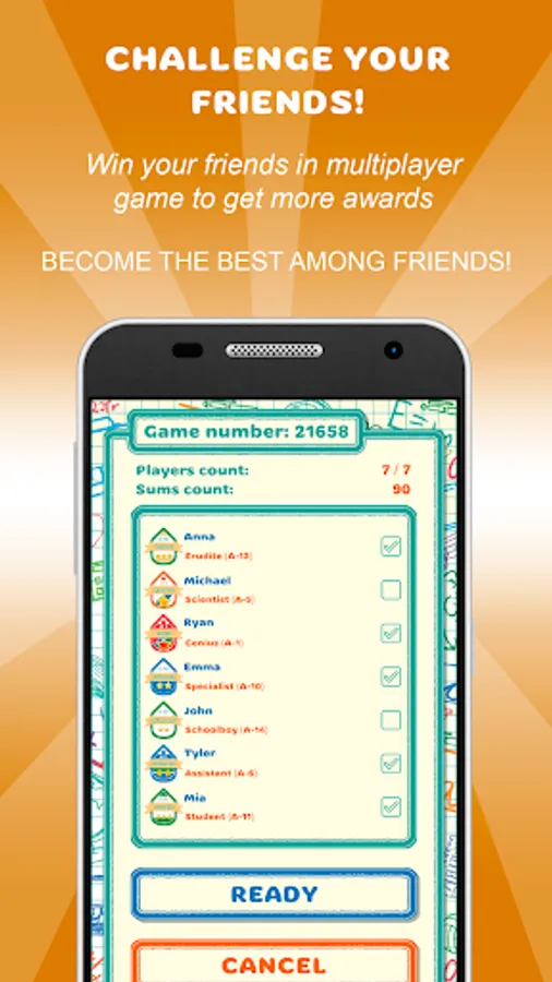 Game points and achievements increase player rating. Ranking system stimulate player to move forward for the next rating doing more sums getting more awards playing more multiplayer games. There are 15 game statuses from the “beginner” to “genius”.
