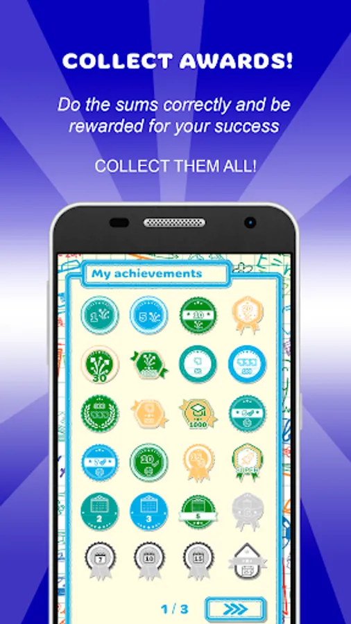 Doing sums step by step kid opens puzzles with images of cute animals and gets awards for different game achievements which in turn increase player rating.