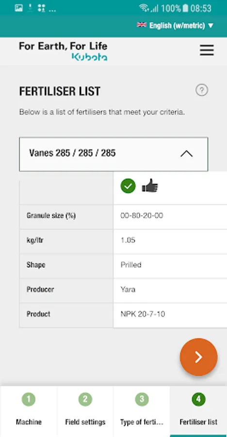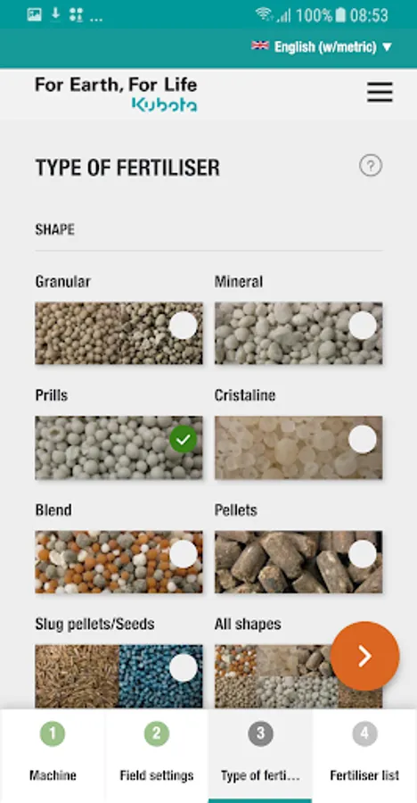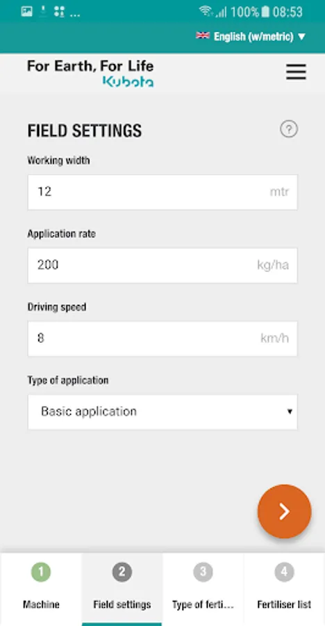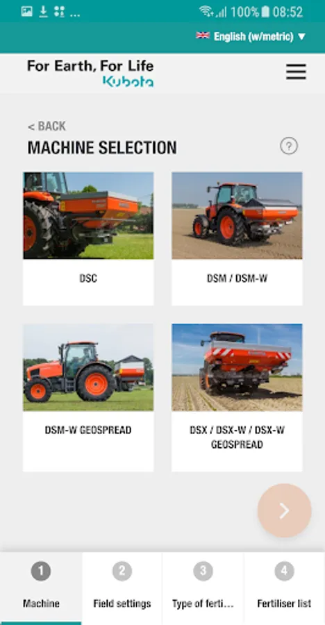 In just some steps, the App guide you to the correct advice for your Kubota fertiliser spreader, anytime, anyplace, anywhere for almost all commonly used fertiliser types.