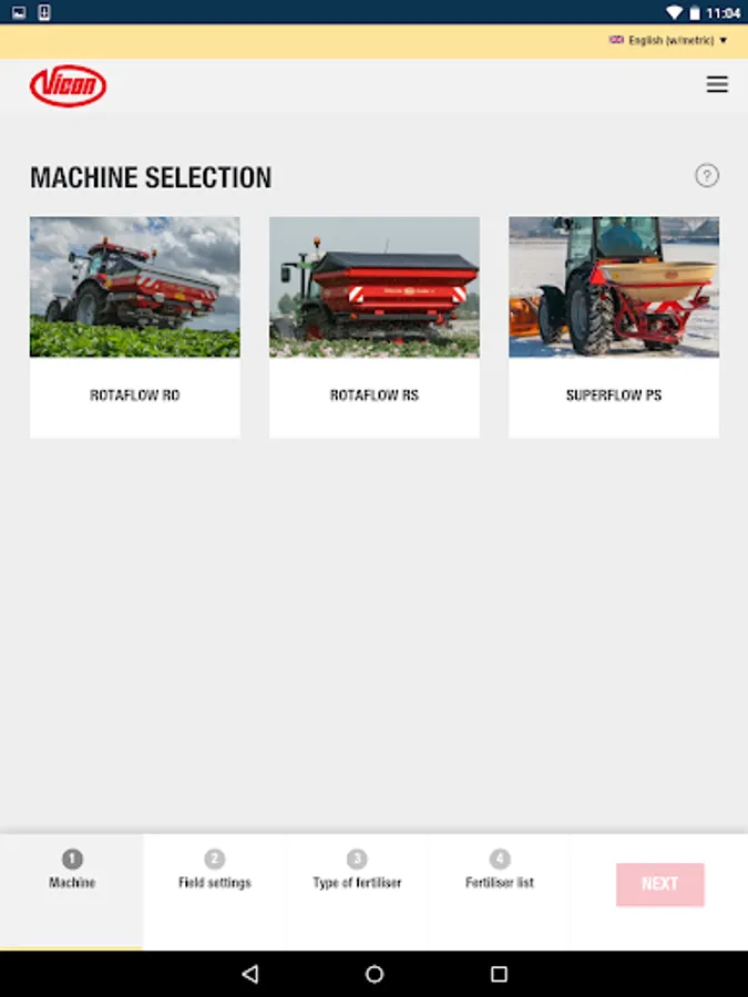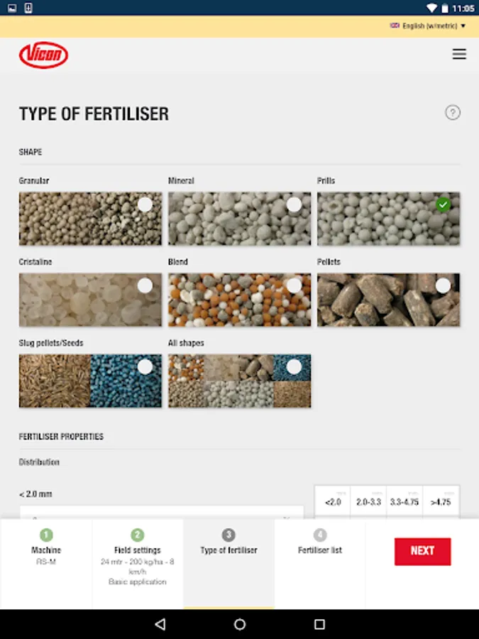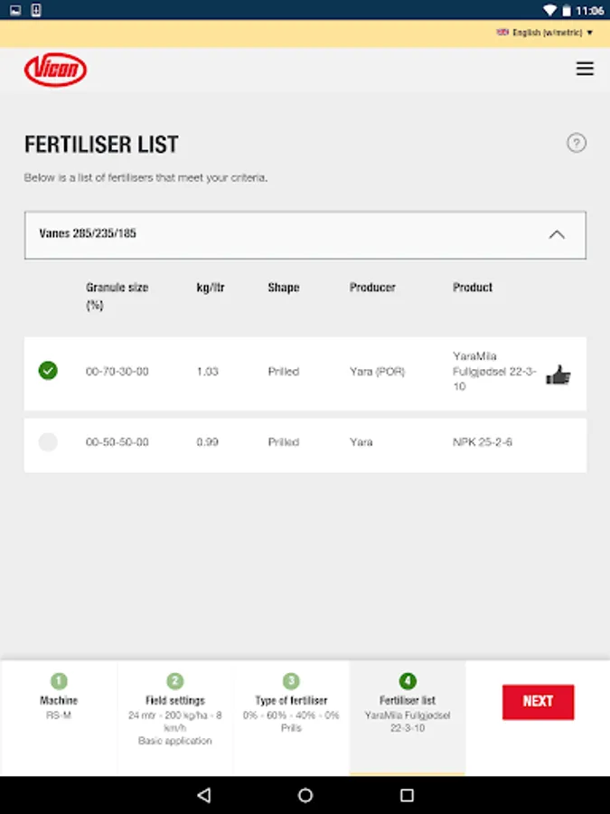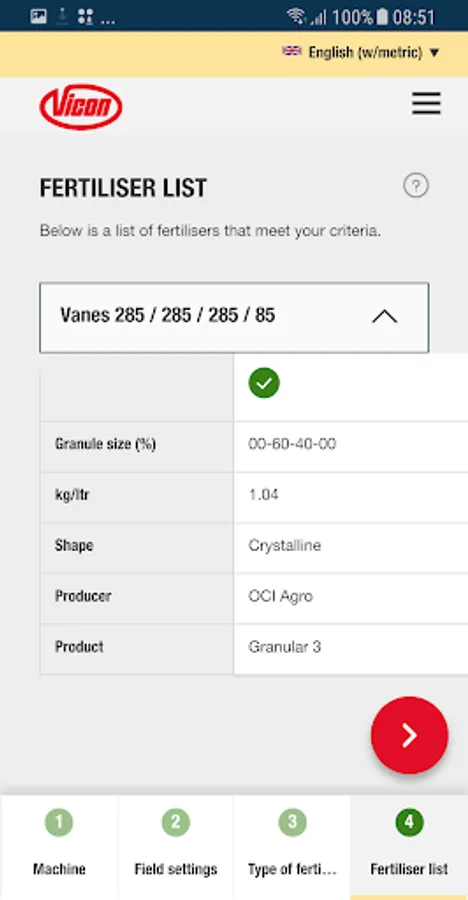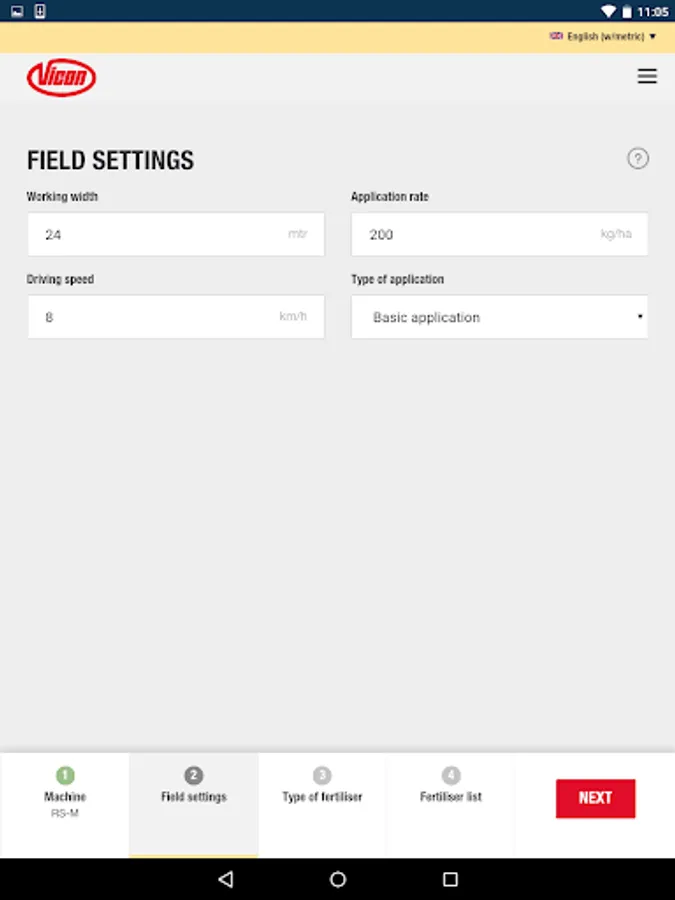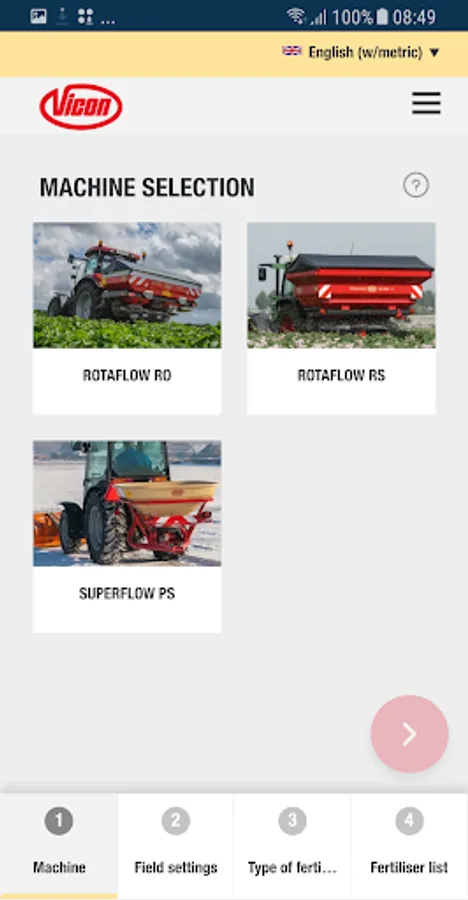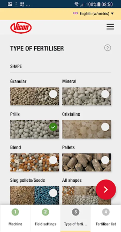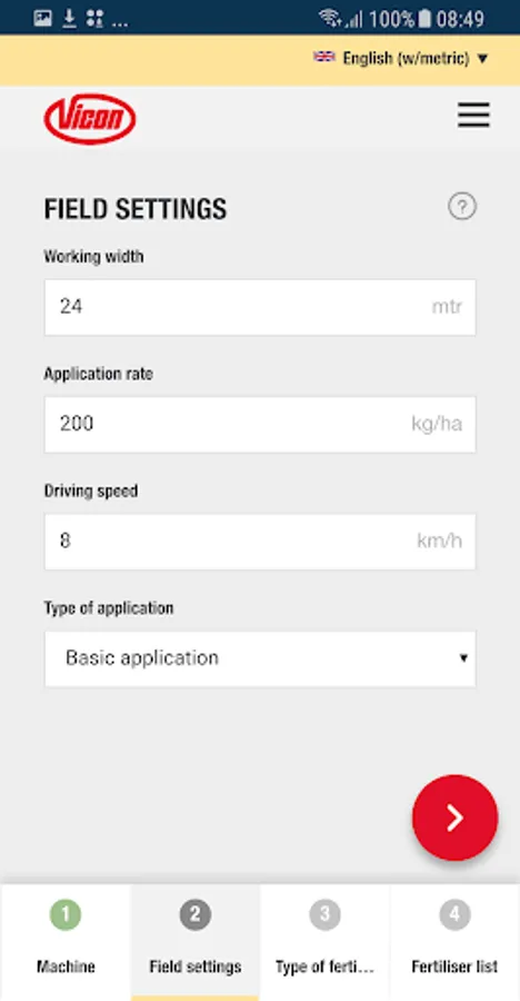 In just some steps, the App guide you to the correct advice for your Vicon fertiliser spreader, anytime, anyplace, anywhere for almost all commonly used fertiliser types.
