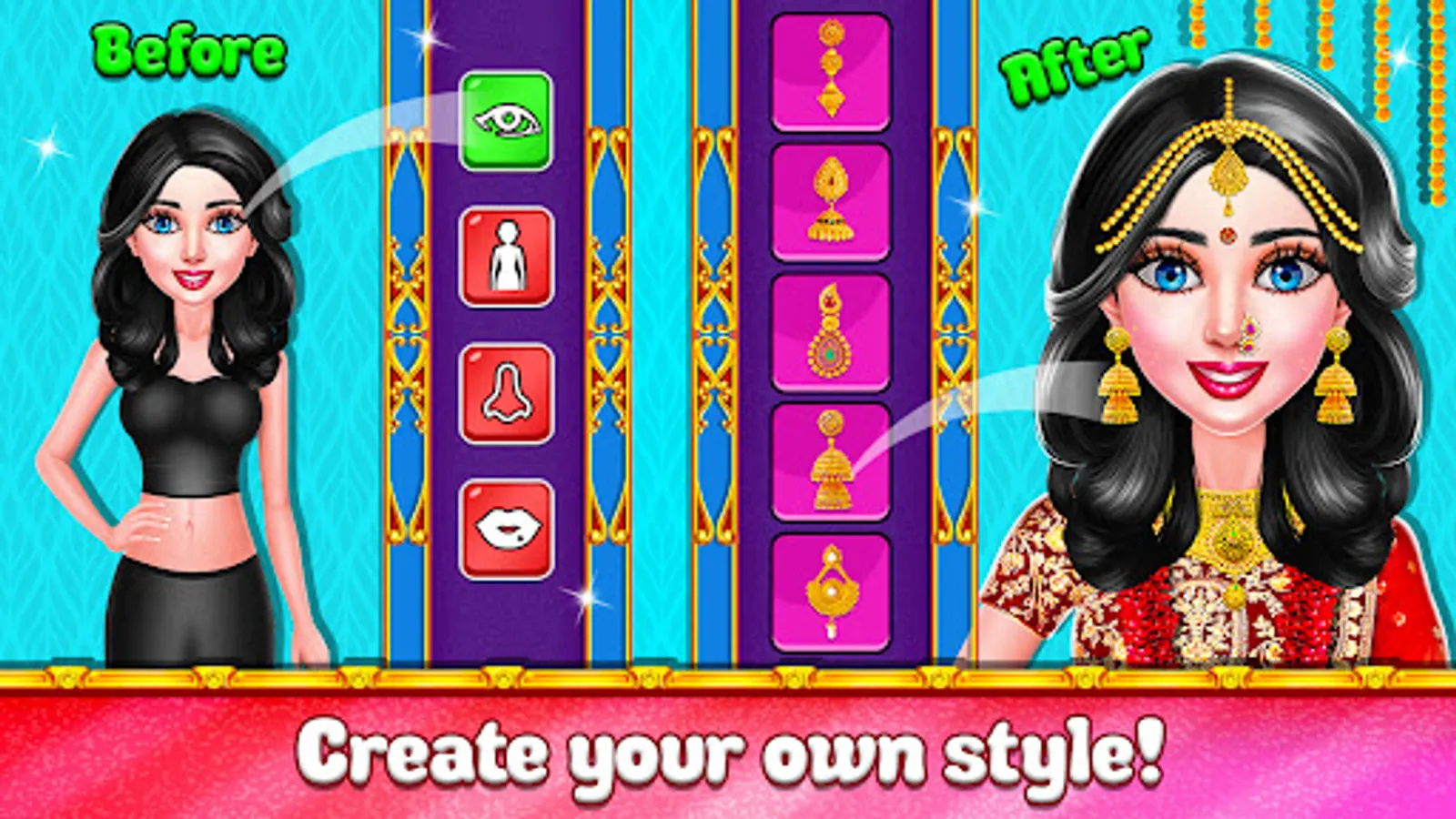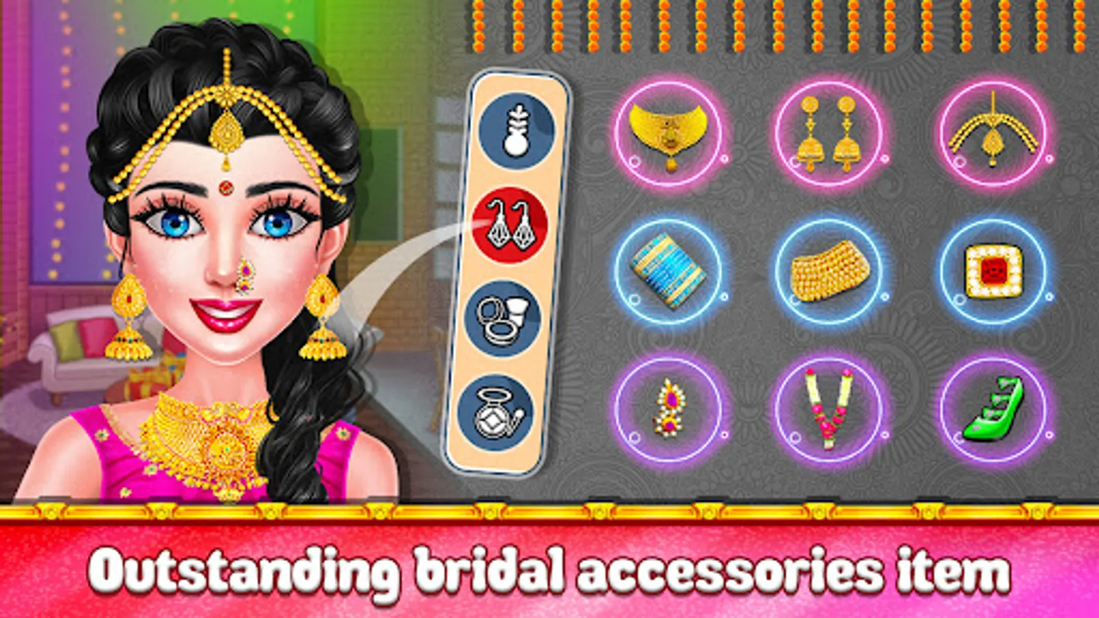 Follow wedding story and design gown for wedding, other rituals costumes, nighty for bridal and makeup halle to make bride an elegant princess in virtual wedding party games. Indian cosmetics of your makeup kit and makeup pallets for wedding bridal at your fashion salon will make you makeup games wedding artist of the country. This Indian wedding games with levels offer beauty game with wedding gown designer, wedding to-do and wedding salon game. Pretty brides from various areas come to get ready for wedding ceremonies and rituals. Show your stylist sense in Hindu and christian wedding games with levels and make girls royal wedding more precious. Fancy sarees, bridal lehengas, elegant dresses, bridal jewellery sets, makeup pallets and sparkly ornaments are perfect for super wedding makeover girls dress up & make up.