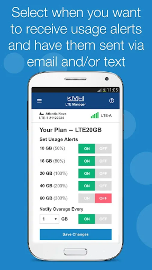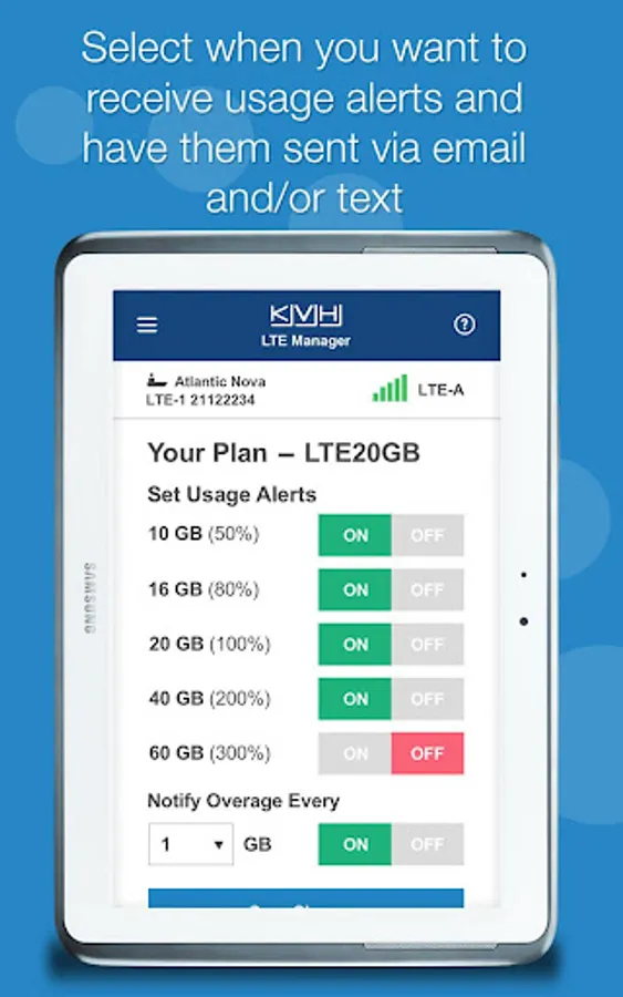 Manage Alerts: Select when you want to receive usage alerts and have them sent via email and/or text message.