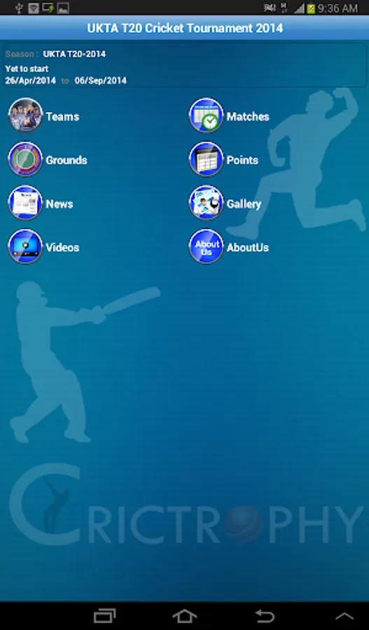 This Online Cricket Tournament Application will help you to access the cricket tournaments created to through www.crictrophy.com