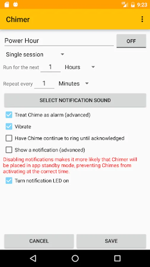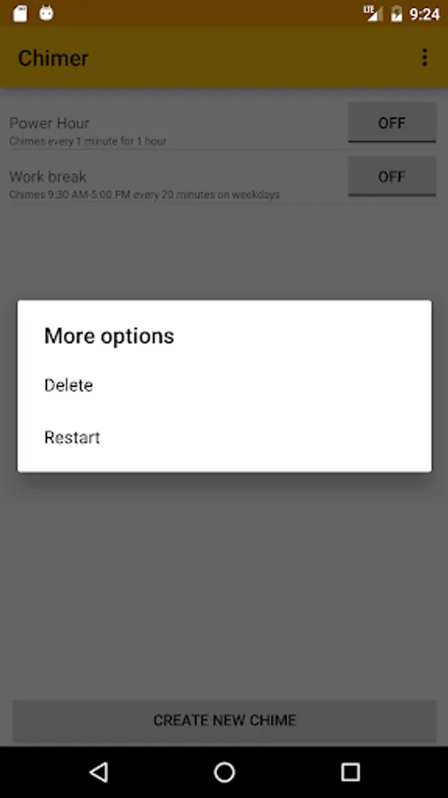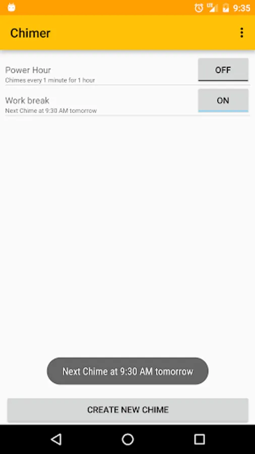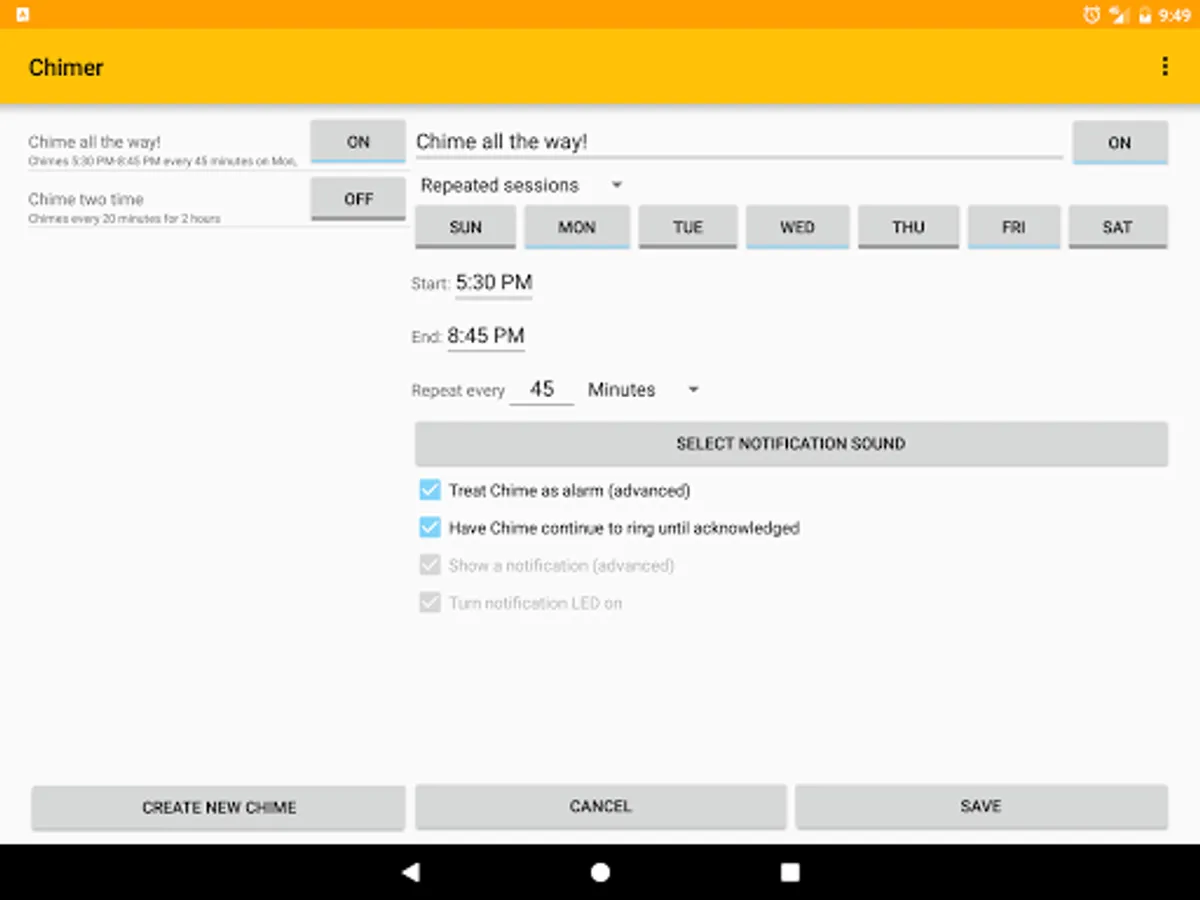 This is a recurring hourly (or minutely) chime/reminder application. Great for time management (such as for the Pomodoro Technique), meditation, cooking, timing experiments, or even as a pills reminder. Just set the time range and how often you want the alarm to go off and lean back and wait (or work, you know, be productive and whatnot). You can create multiple chimes for different needs, each with its own custom settings.