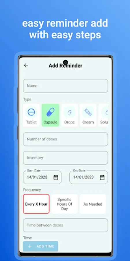 you can add any type of your medication such as : Capsule, Tablet, Injection, etc..