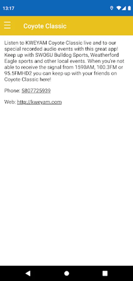 Listen to KWEYAM Coyote Classic live and to our special recorded audio events with this great app! Keep up with sports and other local events. When you're not able to receive the signal from 1590AM, 100.3FM or 95.5FMHD2 you can keep up with your friends on Coyote Classic here!