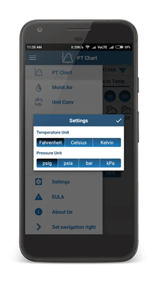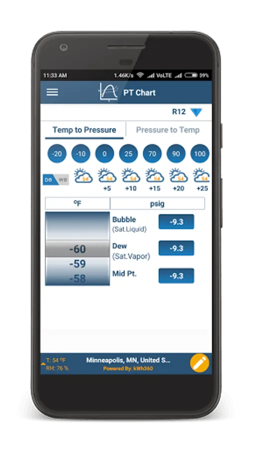 Temperature and pressure units can be freely selected and combined under the PT chart. It converts the saturation pressure (PSIG) to saturation temperature (°F).