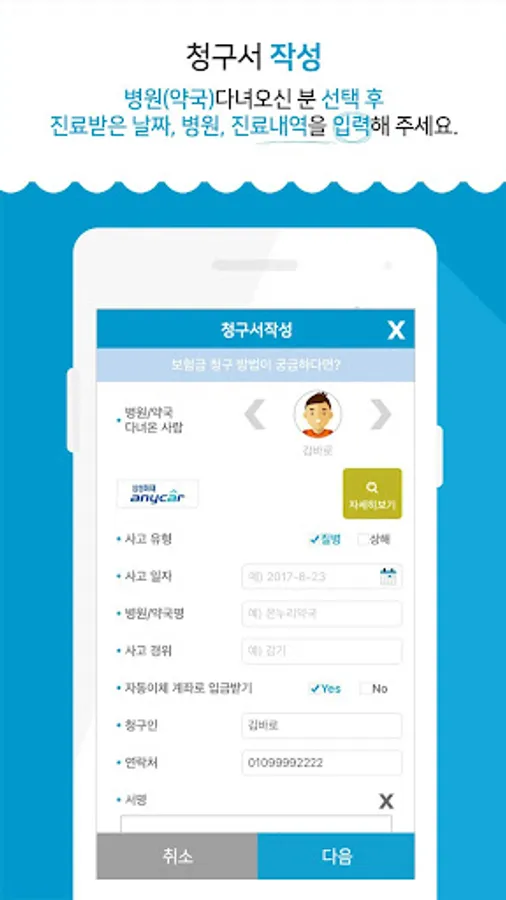 (1) Fill out the claim form: select insurance company, date of accident, name of diagnosis, name of hospital, input of accident details