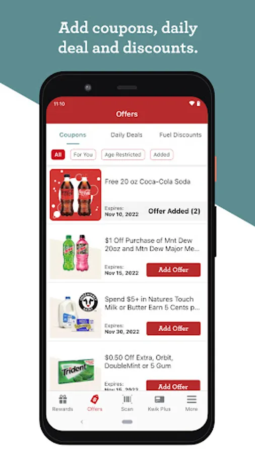 Add coupons to your card, discounts apply automatically after the transactions has completed.